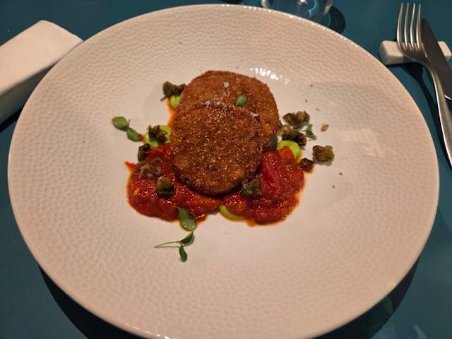 - Le frittelle di broccolo romanesco su coulis di pomodorino giallo e olive taggiasche
