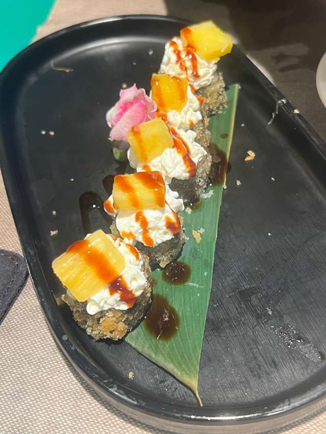 - Rollitos emvueltos con alga rebozado,relleno de salmon con philadelfia y fruta por encima y salsa teriyaki