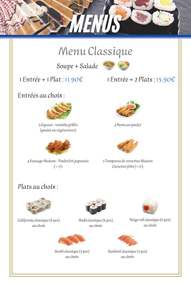 Chez nous, chaque plat est préparé avec soin et authenticité, dans le respect des saveurs nippones. Nos tempuras croustillants, notre karaage maison fondant et doré, ainsi que nos sushis classiq...
