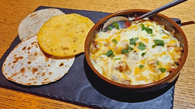 Mix de totopos, chili con ternera gratinada con mix de quesos pico de gallo, guacamole casero y crema agria (no pican)
