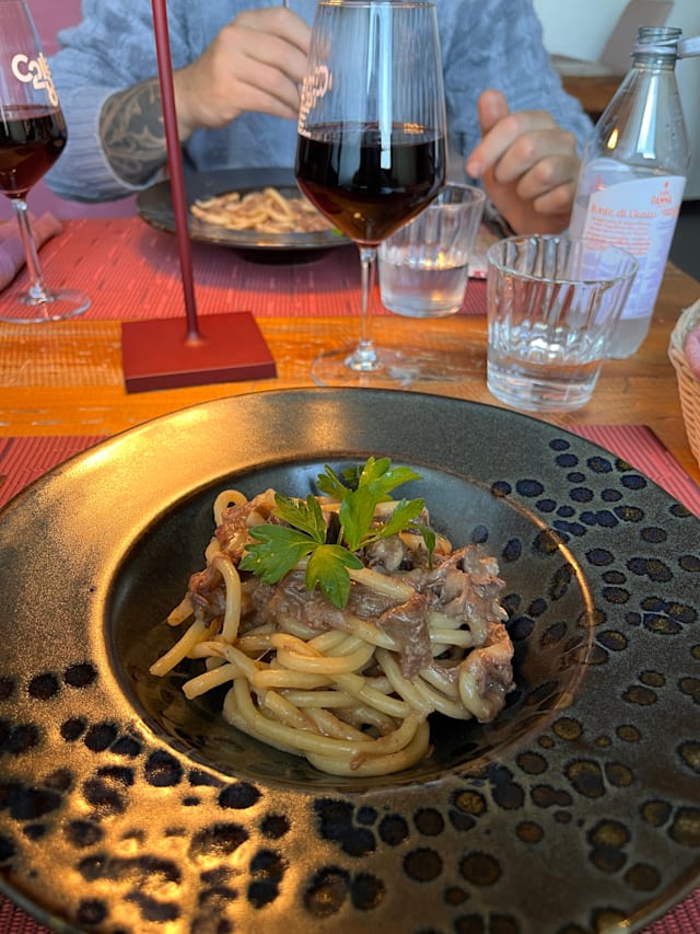 Pici Rustici al Ragù di Chianina, Cipolla dorata e sentore di Alloro