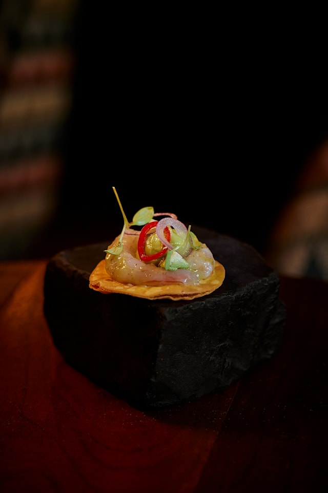 - Tostada com gamba da costa e aguachille “corneto” temaki de tártaro de atum com soja picante tártaro de vaca maturada com parmesão