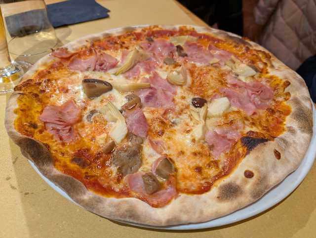 - Pomodoro, mozzarella, prosciutto cotto di praga, carciofi alla brace, porcini trifolati