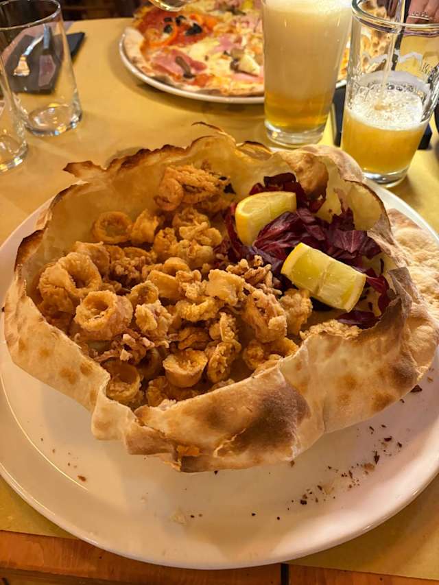- Pomodoro, mozzarella, calamari fritti “home made” in pastella alla birra