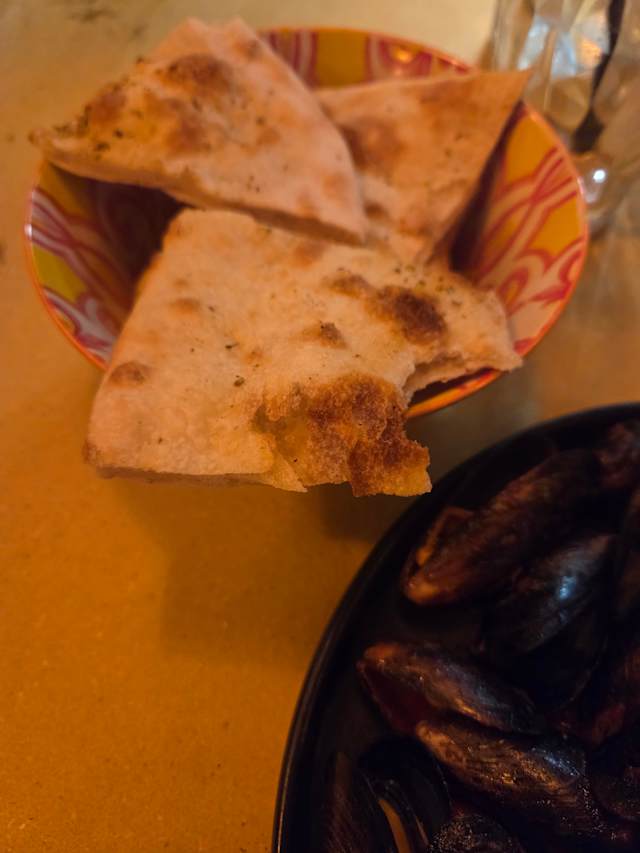 - Cozze, vongole, calamari, gamberoni in guazzetto al pomodoro, con focaccia calda