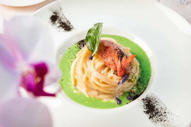- Fusilloni in osmosi di aglio nero con ventresca di tonno e n’duja burrata e cristalli di prezzemolo