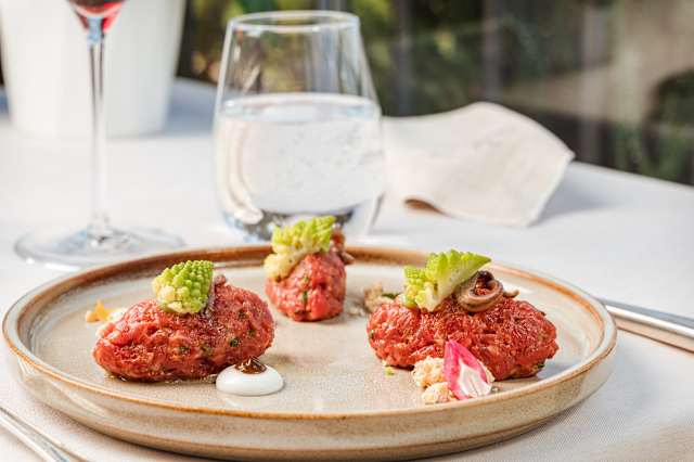 - Fassona piemontese battuta al coltello con croccantella di castagne spuma di mascarpone, rapa rossa e tartufo nero pregiato