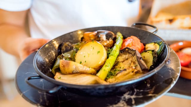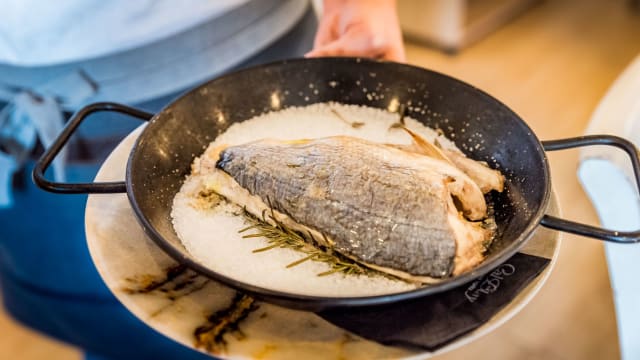 Dorada a la sal de hierbas autóctonas a la brasa con guarnición