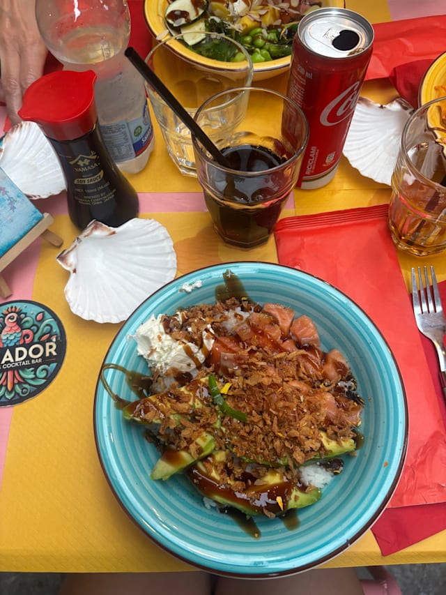 Salmone* , tonno* e gamberi* con avocado, mango* , edamame* , wakame* , zucchine, scaglie di mandorle, philadephia fruttata, semi di sesamo, salsa teriyaki, maionese giapponese
