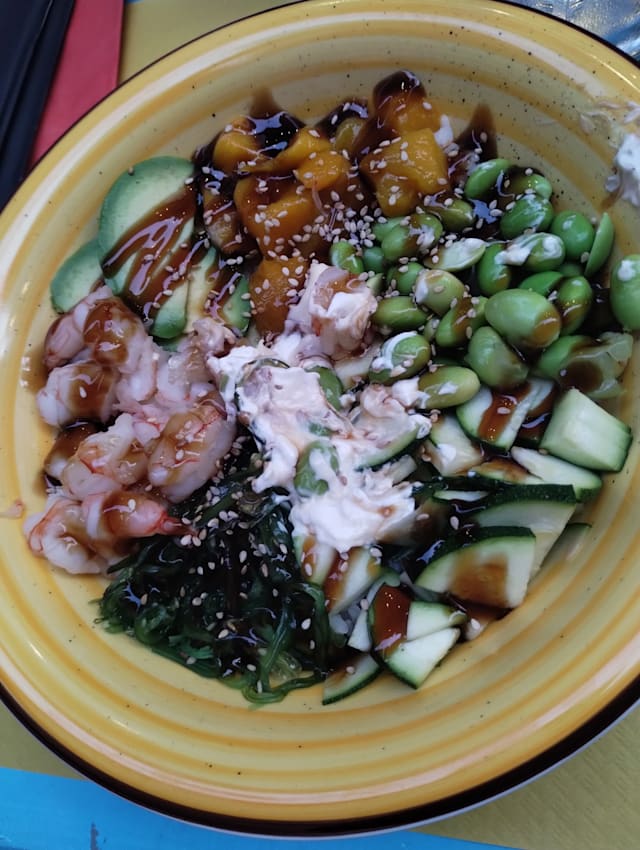 A scelta tra salmone* , tonno* o gamberi* con edamame* , wakame* , philadelphia fruttata, mango* , zucchine, avocado, semi di sesamo, salsa teriyaki e maionese giapponese