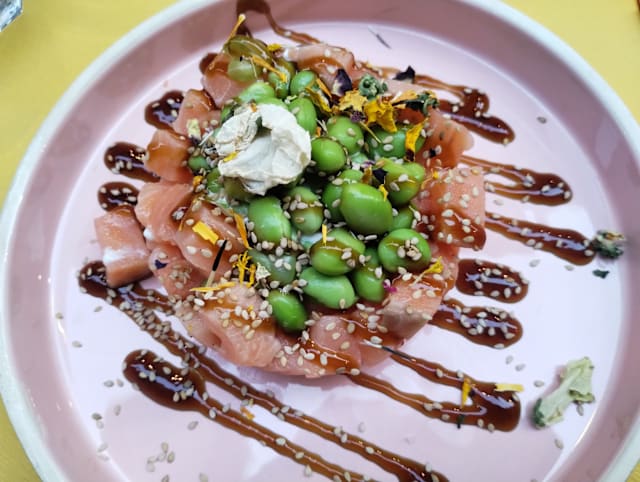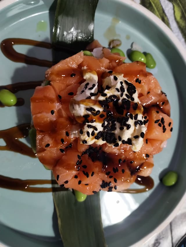 Salmone* , philadelphia fruttata, edamame* , semi di sesamo, salsa teriyaki, riso