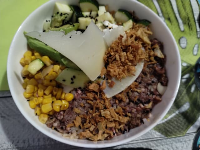 Carne di scottona reale scottata a fiamma viva con philadelphia fruttata, avocado, zucchine, mais, scaglie di formaggio, cipolle croccanti, scaglie di mandorle, salsa teriyaki, glassa di aceto balsamico