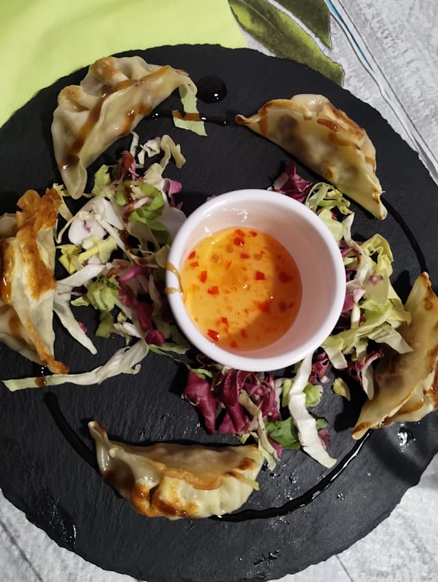 Carne di scottona reale leggermente scottata a fiamma viva, philadelphia, scaglie di formaggio, glassa di aceto balsamico, salsa teriyaki, semi di sesamo, cipolla croccante, riso