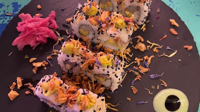 Zucchine, avocado, mais, scaglie di parmigiano, philadelphia fruttata, edamame* , wakame* , semi di sesamo, maionese giapponese, salsa teriyaki
