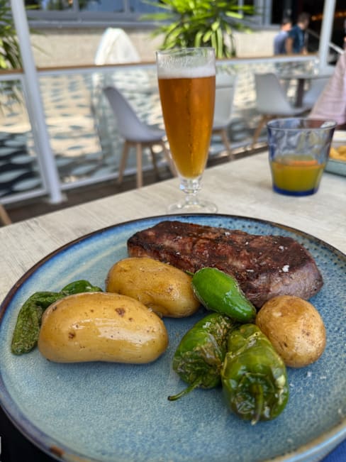 9/10We had an excellent experience at this restaurant, perfectly located at Maremagnum with beautiful views and a relaxed atmosphere. The service was friendly, efficient, and attentive from start to finish, and the prices were very fair considering the quality and location. Drinks arrived quickly, and the beer was served ice-cold — exactly how it should be. We started with a tapeo of perfectly seasoned olives and a delicious gambas al ajillo full of flavor. The fish and chips were juicy and crispy, and the entrecôte was tender, flavorful, and cooked to perfection. Everything was fresh, well-prepared, and nicely presented. A great spot for a casual yet high-quality meal in Barcelona. Highly recommended!