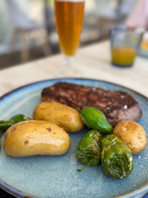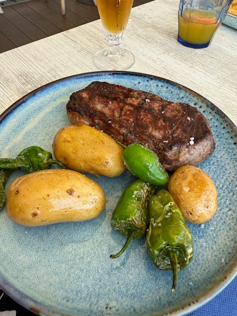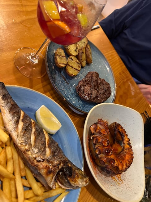 6/10This is a great location with beautiful atmosphere and views: but the food is not great, and the service is clearly geared towards tourists and trying to squeeze as much as possible out of every table. Starting with food, is very bland and not worth the price level. Fish & chips was very dry and tasteless, one of the worse we had ever had. Steak was quite chewy and not cooked properly. Prawns tapas and vegetables tapas were good enough: nothing wow, but decent. The service was warm but not very attentive. But biggest problem is lack of transparency: they bring 4 pieces of bread, without you having ordered and asking for it (and you later pay about 2 euro for each…), water comes in refillable bottles (not great) and it’s overpriced. We had a 50% the fork discount, they did not apply at first, they when asked did so but: service excluded, drinks excluded, bread excluded… also they ad a 8% “terrace surcharge” which god knows what means: we were not at the seafront terrace