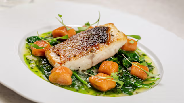 - Sea bass, tomato gnocchi, spinach and cockle velouté