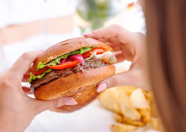 Hamburger, caciocavallo, lattuga, pomodoro e cipolla rossa in agrodolce