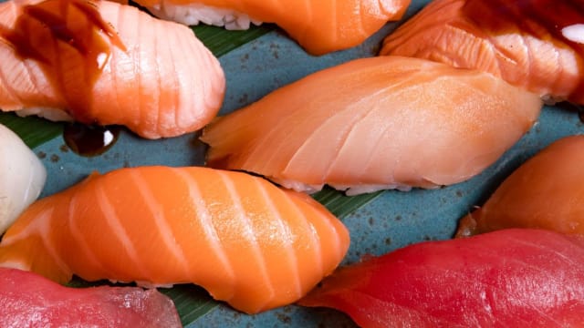 Kani* (Granchio), Gambero cotto, Mayonese e Avocado, ricoperto da Salmone scottato e fiocchi di Tempura