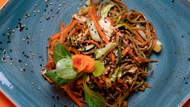 Gambero in tempura di corn flakes, maionese giapponese, spigola scottata, ricoperto da avocado, salsa teriyaki e fiocchi di patata viola
