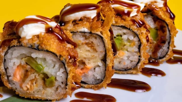 (Rolls in Tempura con Salmone, Tonno, Granchio Kani*, Avocado, Philadelphia e Salsa Teriyaki)