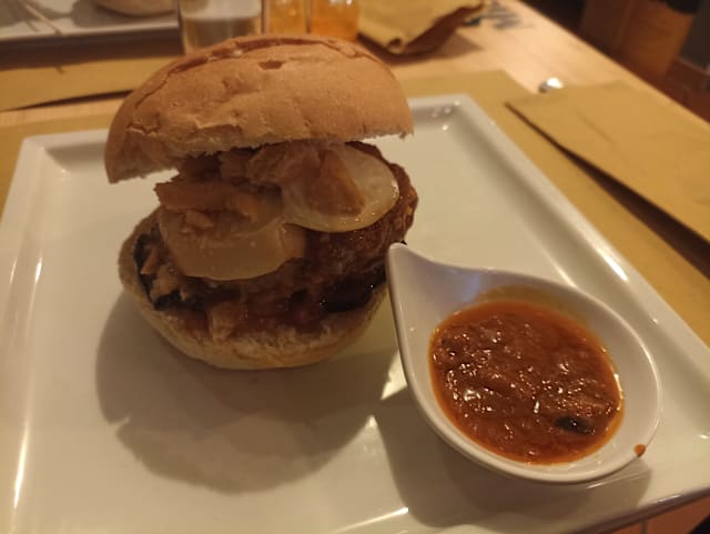 Bun fresco, 100gr di pulled pork* di suino nostrano preparato con metodo di cottura “low&slow” (cotto a bassa temperatura per 12h), marinato con a nostra birra artigianale “balorda”, scaglie di grana padano dop, insalata “coleslaw”, salsa smokey miscela fatta in casa