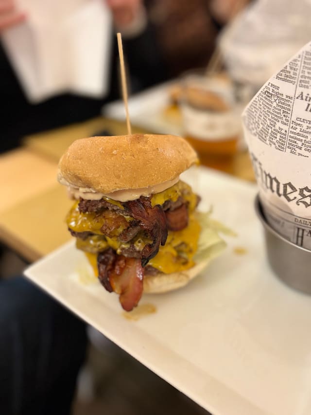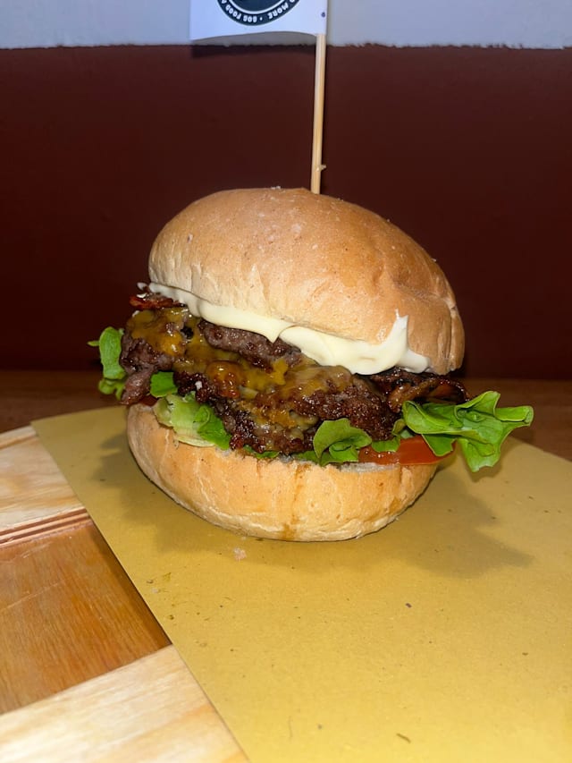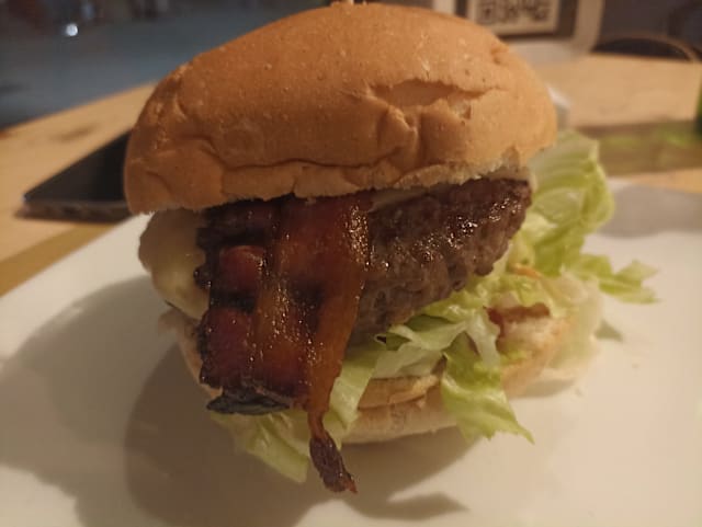 Bun fresco, hamburger* di scottona nazionale da 200gr, edamer, bacon croccante, pomodori confit, insalata, maionese