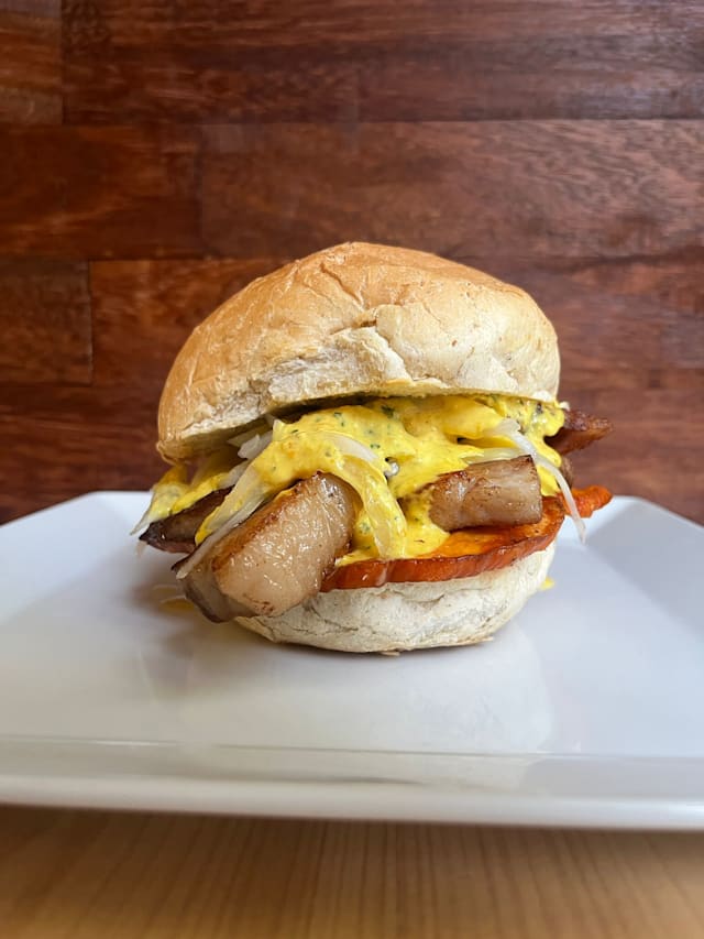 Bun fresco, 100gr di pulled pork* di suino nostrano preparato con metodo di cottura “low&slow” (cotto a bassa temperatura per 12h), marinato con a nostra birra artigianale “balorda”, scaglie di grana padano dop, insalata “coleslaw”, salsa smokey miscela fatta in casa