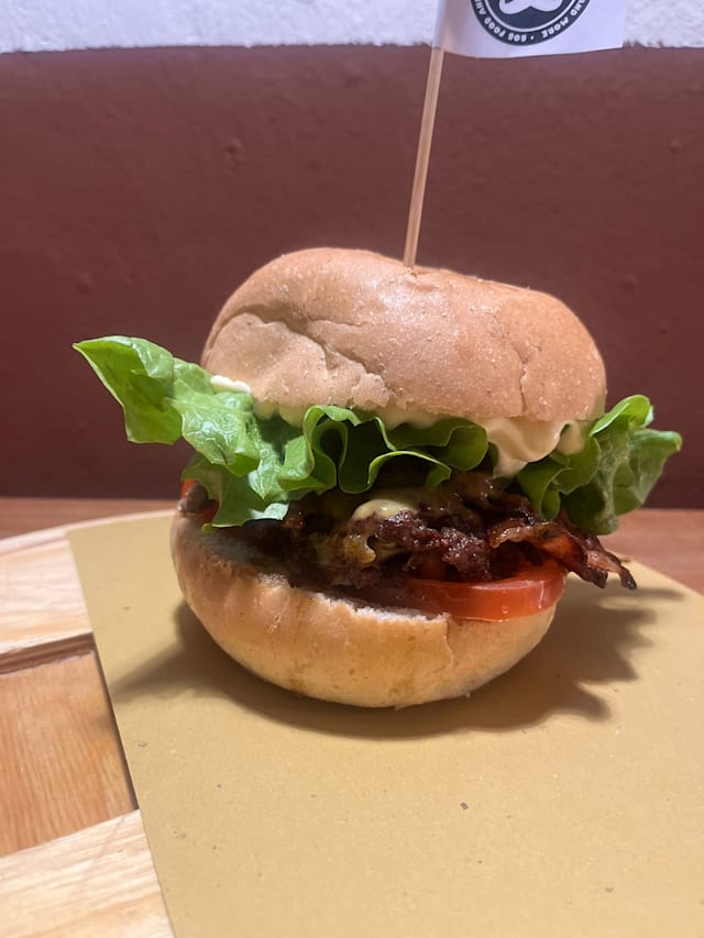 Bun fresco, hamburger* di scottona nazionale da 200gr, bacon sbriciolato, insalata, maionese al gorgonzola dolce dop, arancia confit fatta in casa