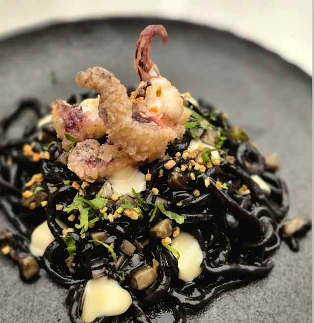 - Linguine noire fait maison, ragoût de seiche, aïoli, seiche frite
