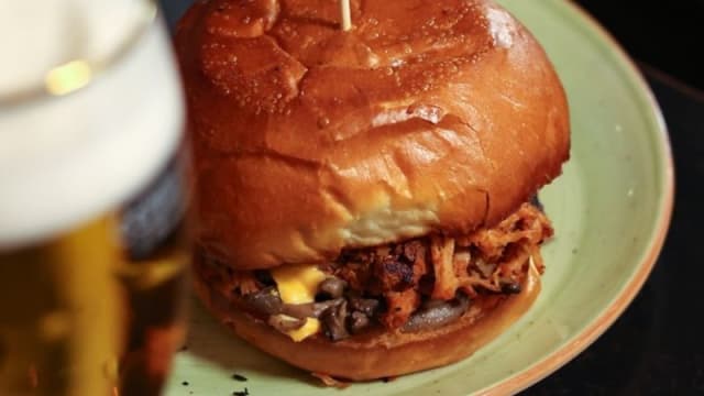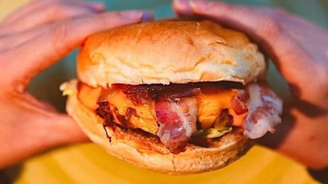 Bun hamburger, bacon, opolla di tropea caramellata lattuga, cheddar americano, salsa bbq affumicata