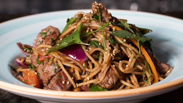 Fideos con ternera, salteados con tomate, cebolla y cilantro