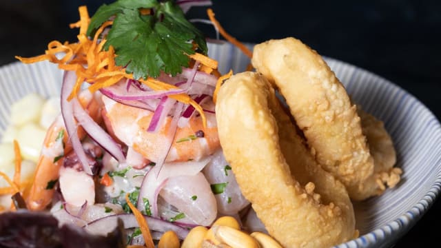Pescado marinado con nuestra leche de tigre, pulpo y langostinos con cilantro, cebolla, lima, acompañado de choclo y chicharrón de calamar