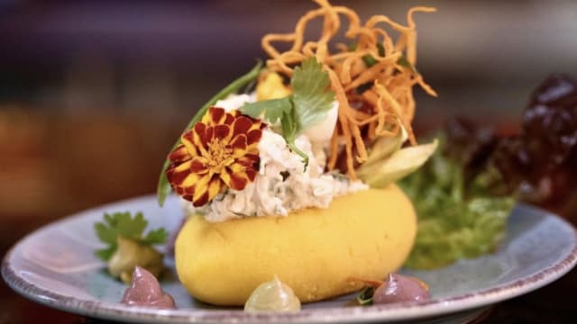 Patata prensada aliñada con zumo de limón y ají amarillo, rellena de aguacate acompañada de ceviche