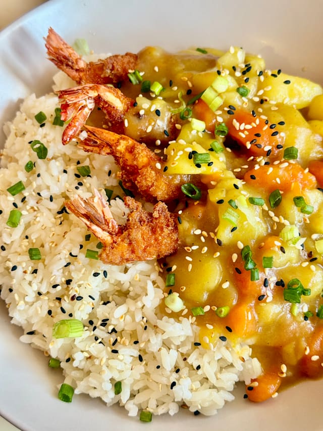 Tempura crevettes, pomme de terre, carotte, sauce au curry crémeuse et riz blanc