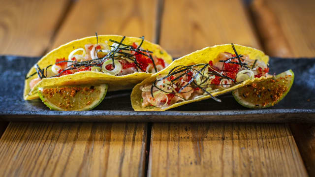 atum, creme de trufa, kizami wasabi, kimchi com molho ponzu / tuna, truffle cream, kizami wasabi, kimchi with ponzu sauce