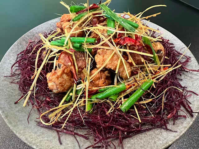 Seta enoki, alga, tofu (piel y frito), salsa picante al comino y baocui.