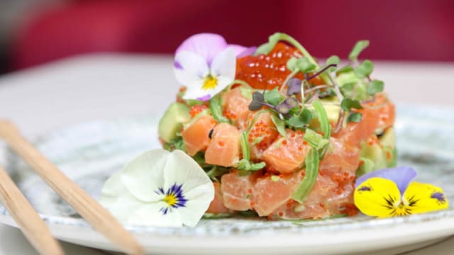 - Tempurizado de salmón y queso cremoso, cubierto con tartar de salmón y finas hierbas, mayonesa japonesa y salsa teriyaki. (6 piezas)