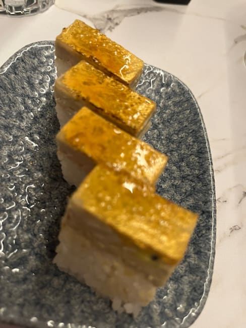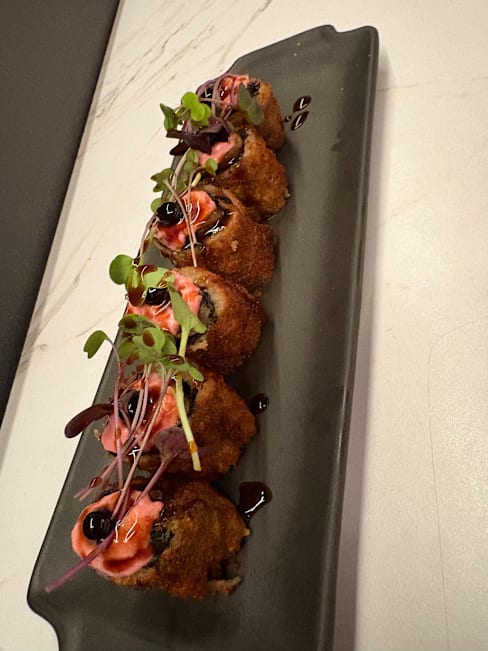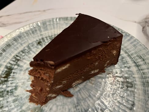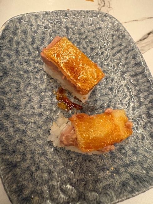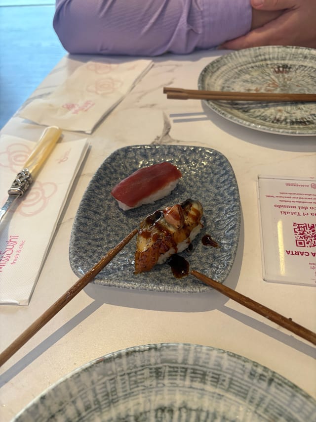 7.5/10+2Some tasty foie gras apple sushi, chicken katsu and goats cheese rolls, tuna tataki flambéed at the table. The abuela or grandmother cake is a kind of chocolate mousse with biscuits. Only nit pick is that the spider crab rolls didn’t contain any fresh crab, and even after being sent back to the kitchen they only added a crab paste.