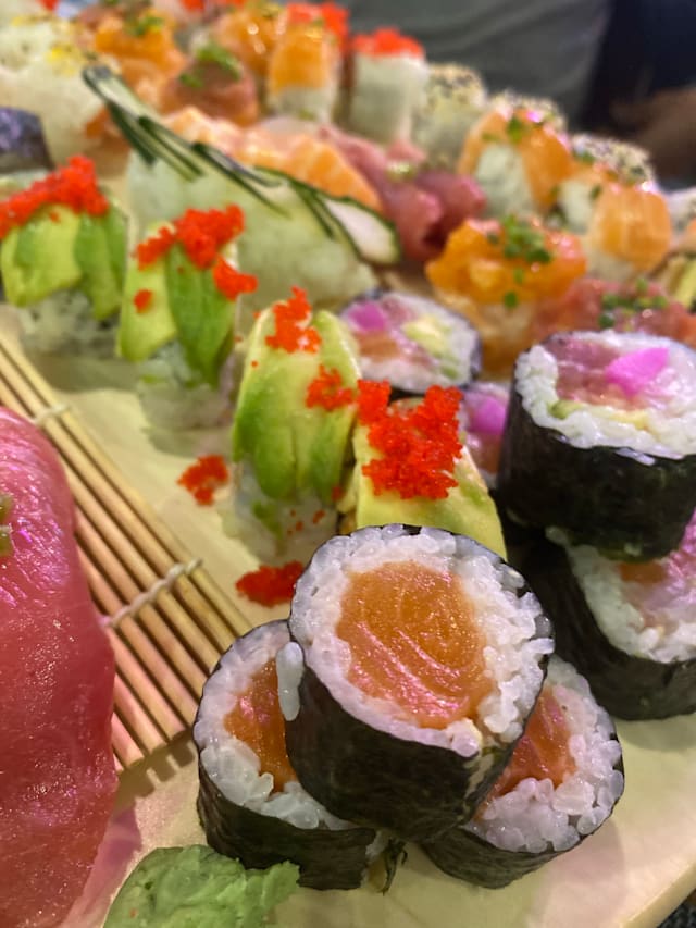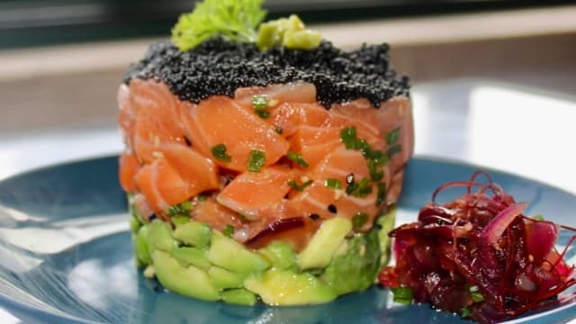 (base de arroz, salmão, abacate, sunumono, sementes de gergelim e molho ponzu)
