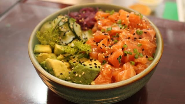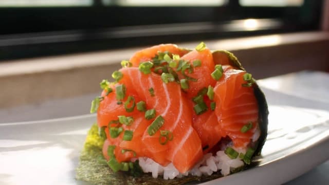 (Base de arroz, salmão, abacate, sunumono, sementes de gergelim e molho ponzu)