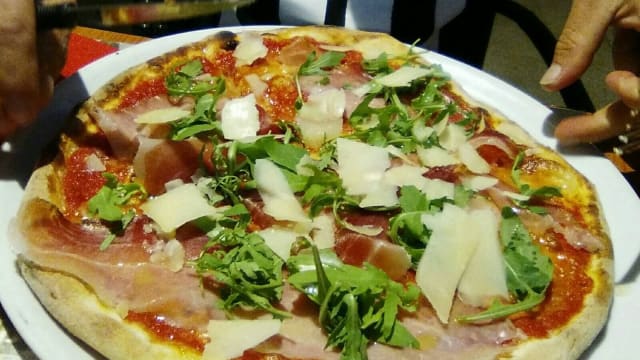 Pomodoro, mozzarella fior di latte, prosciutto crudo, rucola, grana, olio tartufato scaglie di grana