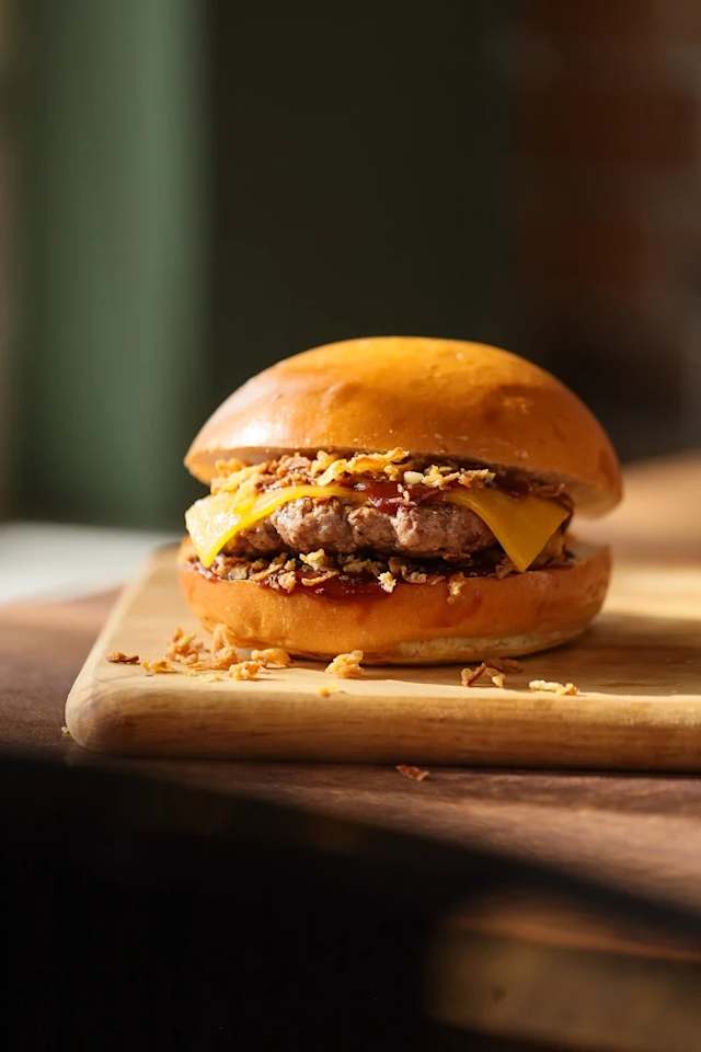 130 g de brutos do acém, molho de barbecue, queijo cheddar e cebola frita