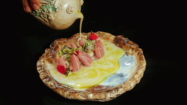 Hamachi, ponzu, aji amarillo, tartufata, chalaquita de kiuri, jalapeño, sal hawaiana, arroz suflado y aceite de cilantro
