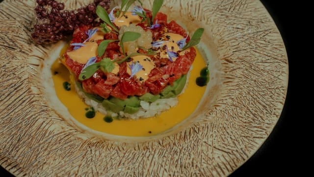 Tartar de salmón, rocoto, aguacate, cebolleta, tanuki, saiko miso de aji amarillo, sake, semillas de sésamo y arroz suflado