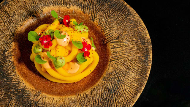 Corvina, langostino tigre, chipirón, leche de tigre de rocoto y chili garling, zarandaja, pure de boniato, miso, choclo ybrotes