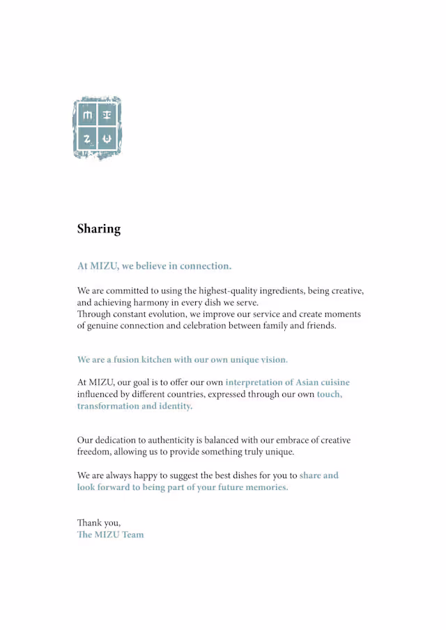 Mizu EriceiraThank you so much for your lovely words! 😌 We’re thrilled to know you enjoyed the food, service, and atmosphere. Hope to see you again soon at Mizu!