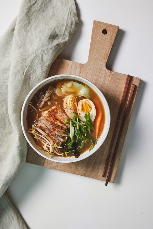 - Caldo de legumes, frango e vaca com miso, barriga de porco, ovo, cogumelos, cenoura, nori, pack choi e massa.