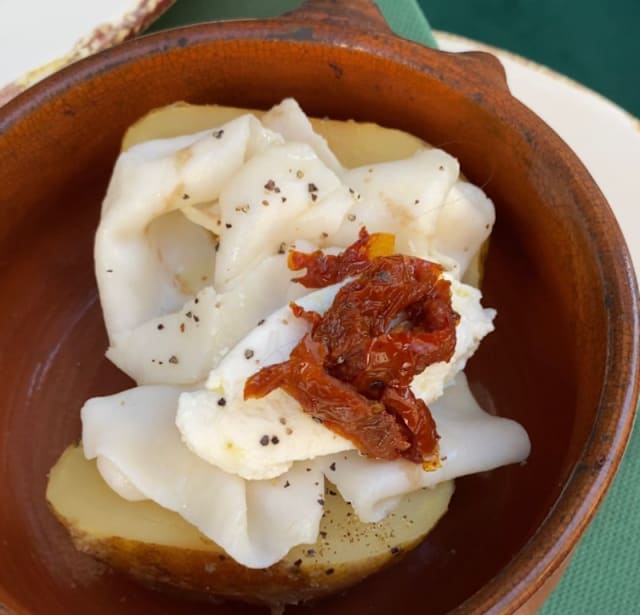 Patata alla cenere con lardo, ricotta e pomodori secchi