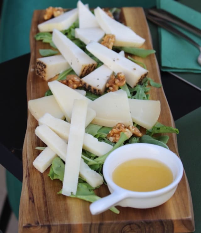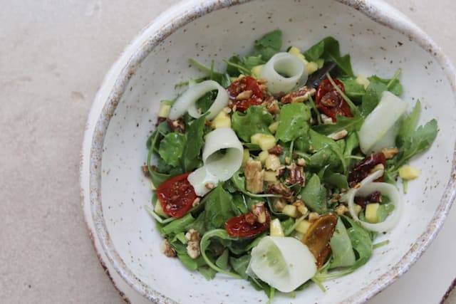 Misticanza, zucchine marinate, mousse di ricotta, cipolla rossa in agrodolce, mandorle